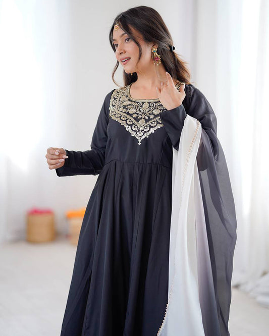 White Color Soft Vichitra Silk Anarkali With Black Dupatta