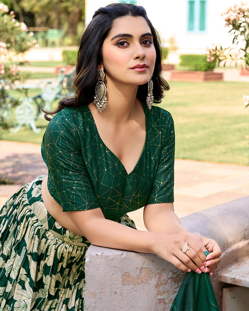 Green Color Tussar Silk Floral And Foil Printed Navratri Lehenga Choli