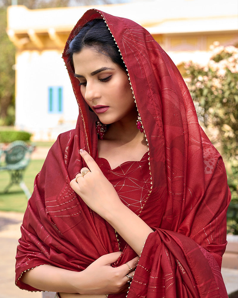 This red-colored Navratri lehenga choli, made from luxurious Tussar silk, is adorned with elegant floral and foil prints. Complete with an unstitch blouse for a personalized fit, this ensemble blends traditional beauty with contemporary flair, making it ideal for festive celebrations.