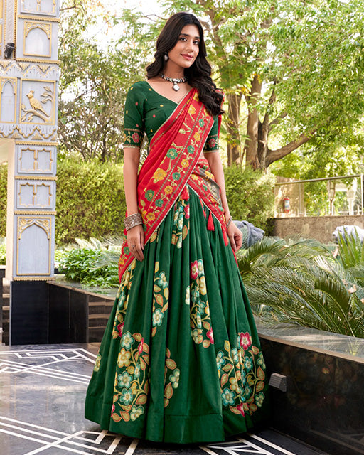 Green Color Tussar Silk Printed With Foil Work Lehenga Choli