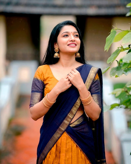 South Indian Style Mustard Color Narayan Pet Cotton Half Saree