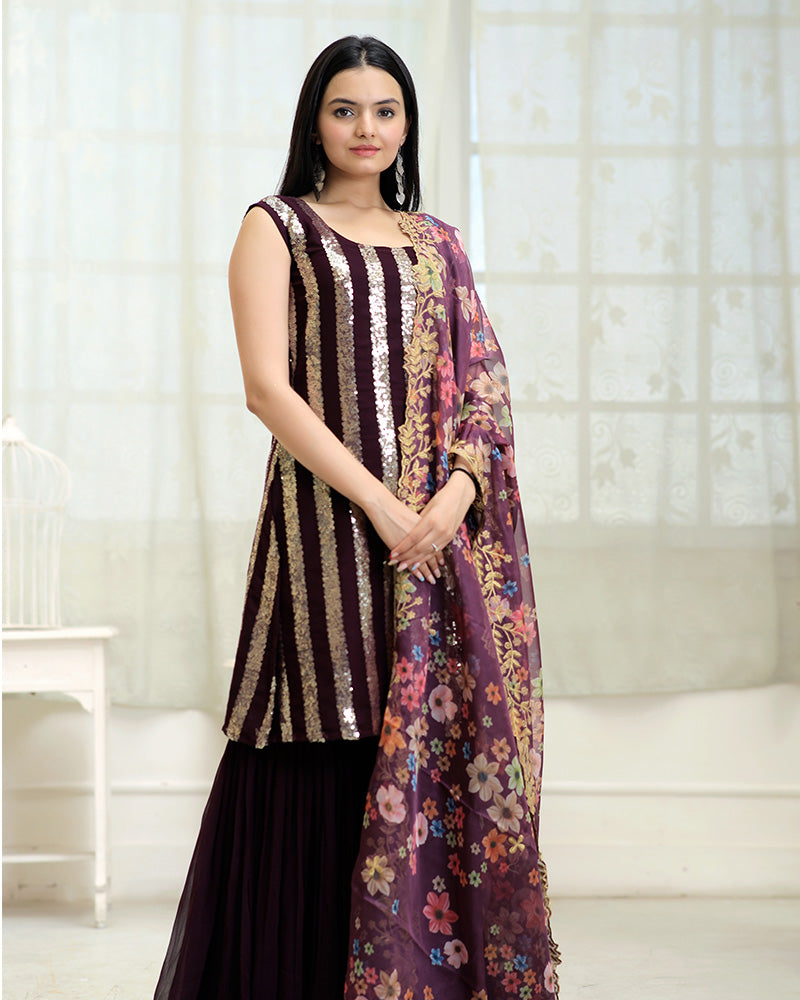 "Indulge in the epitome of elegance with our Pink Color Designer Three-Piece Sharara Suit. This exquisite ensemble features a beautifully crafted pink kurta adorned with intricate embroidery and delicate embellishments, exuding grace and charm. The accompanying sharara pants add a touch of modern flair, offering a comfortable yet stylish silhouette. Completing the look is a matching dupatta that drapes gracefully, enhancing the overall sophistication of the outfit. Perfect for special occasions, this ensemble seamlessly blends traditional craftsmanship with contemporary design, making you the epitome of grace and style."