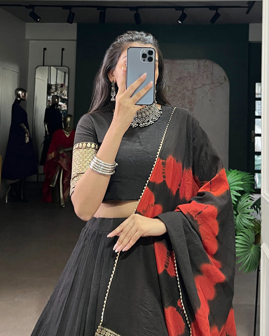 Red Color Tasar Silk Laheriya Printed Lehenga Choli