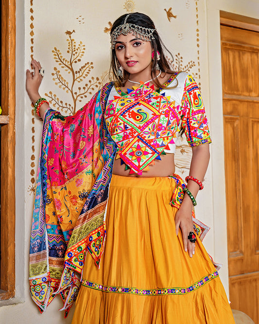 Mustard Yellow Color Real Mirror Work Rayon Navratri Lehenga Choli