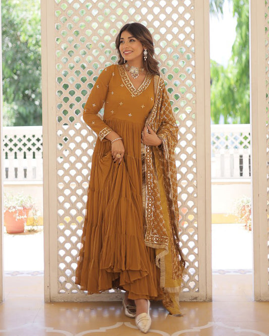 Mustard Color Faux Georgette Designer Anarkali Gown With Dupatta