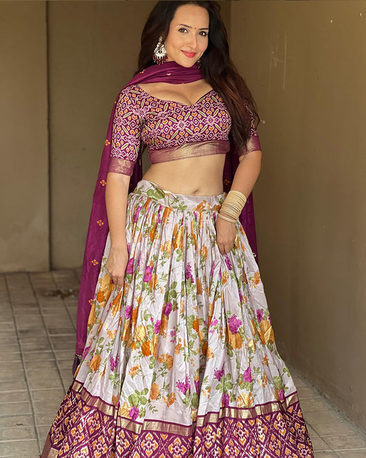Wine Color Tussar Silk Floral And Patola Printed Navratri Lehenga Choli