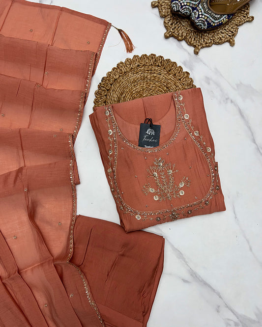 Chikoo Color Fendi Silk Embroidered Plazzo Suit