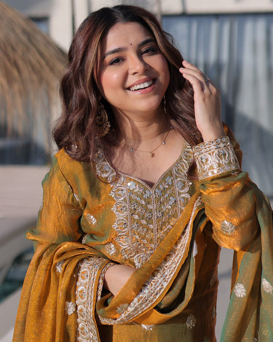 Golden Olive Color Fendi Crush Embroidered Plazzo Suit
