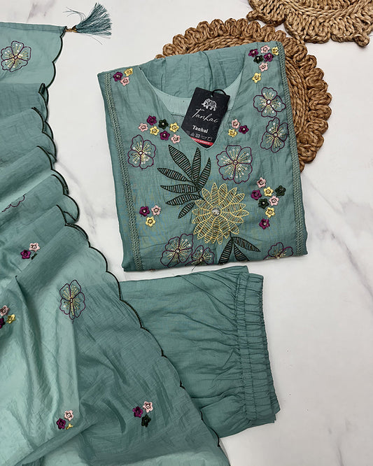 Dusty Teal Color Super Silk Embroidered Sharara Suit