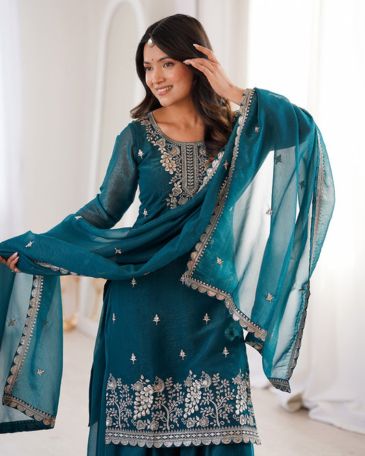 Teal Blue Color Soft Crunchy Silk Embroidered Plazzo Suit