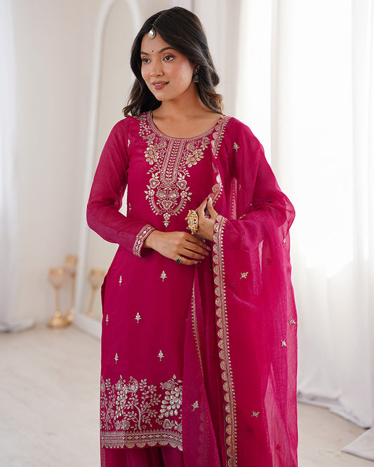 Rani Pink Color Roman Chanderi Silk Embroidered Plazzo Suit