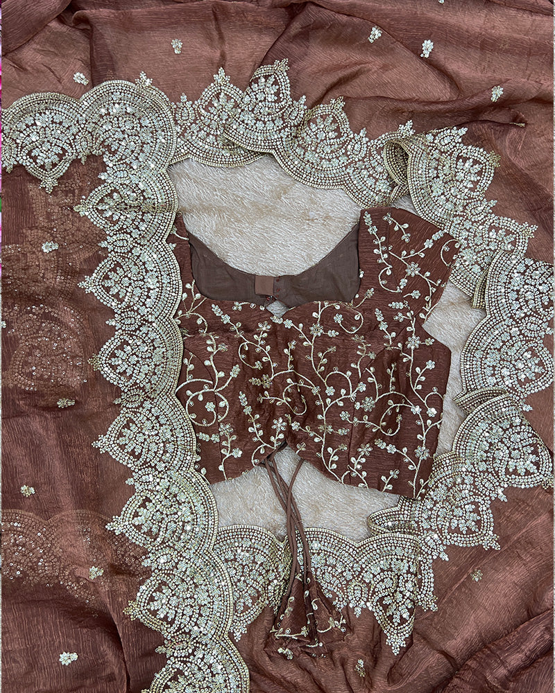 Elegant and dazzling, this 11-Color Fendi Chiffon Saree features beautiful sequin embroidery that adds a touch of glamour. Paired with an unstitched blouse, it’s perfect for parties and festive occasions.