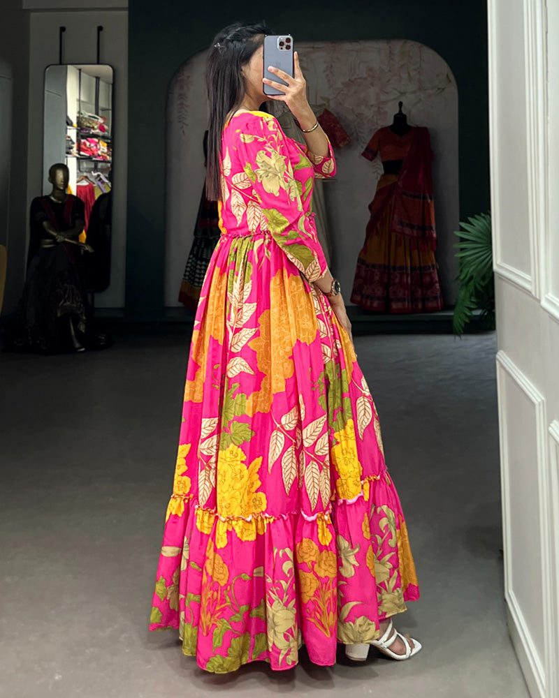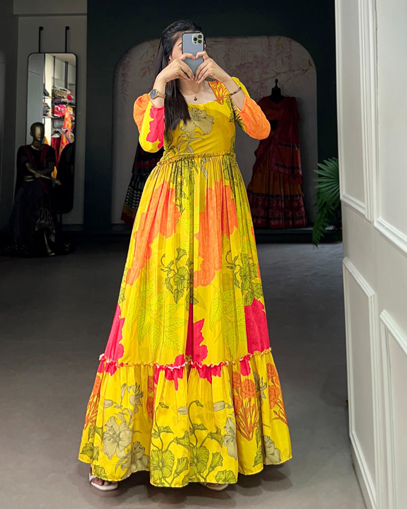 Introducing our Two-Color Crepe Silk Floral Printed Gown, a stylish and elegant choice for any special occasion. This gown features luxurious crepe silk fabric adorned with a beautiful floral print, blending two stunning colors seamlessly. The flowing silhouette and intricate design make it a perfect outfit for making a sophisticated statement. Ideal for weddings, parties, or festive events, this gown combines comfort with contemporary fashion, making it a standout addition to your wardrobe.