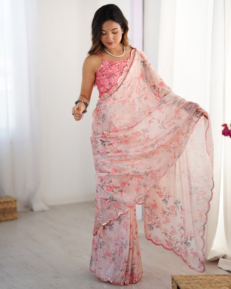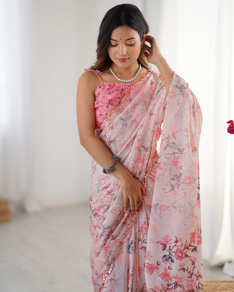 Baby Pink Color Chinnon Silk Mirror Work Saree