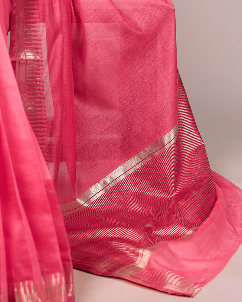 Elegant baby pink cotton silk saree featuring delicate zari weaving, paired with an unstitched blouse. Perfect for weddings, festivals, and traditional celebrations.