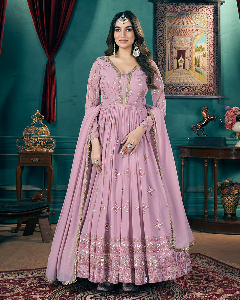 Embrace elegance with this baby pink faux georgette gown, adorned with metallic foil work. The gown features a flowing silhouette that exudes sophistication, paired with a matching dupatta to complete the look. Perfect for weddings and festive occasions, this ensemble combines modern glamour with traditional charm, ensuring a stunning and memorable appearance.