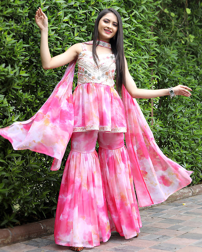Baby Pink Color Georgette Embroidery Work Three Piece Sharara Suit