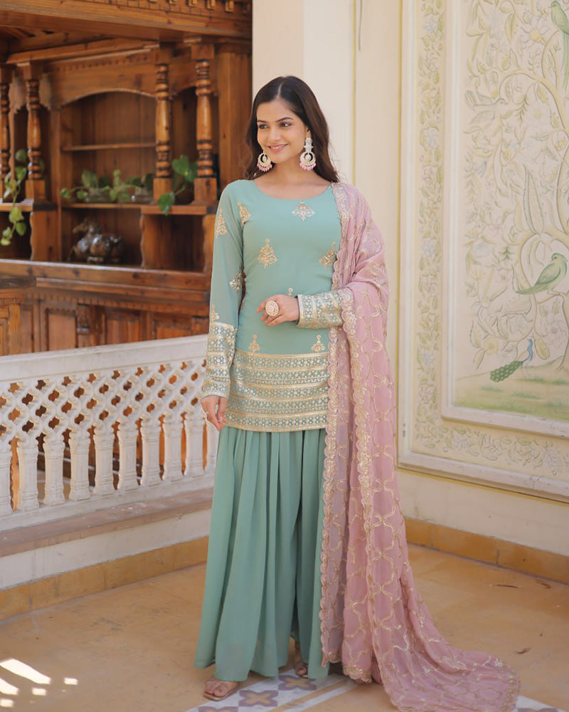 Embrace sophistication in this Beautiful Bottle Green Color Georgette Three-Piece Palazzo Suit. The deep and rich bottle green hue exudes elegance and charm, creating a striking and refined ensemble. Crafted from flowing Georgette fabric, the palazzo suit features intricate detailing that adds a touch of opulence to the overall look. The kurta, paired with wide palazzo pants, and a complementing dupatta, strikes the perfect balance between comfort and style. Ideal for various occasions, this Bottle Green Georgette Three-Piece Palazzo Suit is a delightful choice for those who seek a perfect blend of tradition and contemporary fashion. Step into any event with confidence and poise, embodying the understated beauty and refined allure of this enchanting suit.
