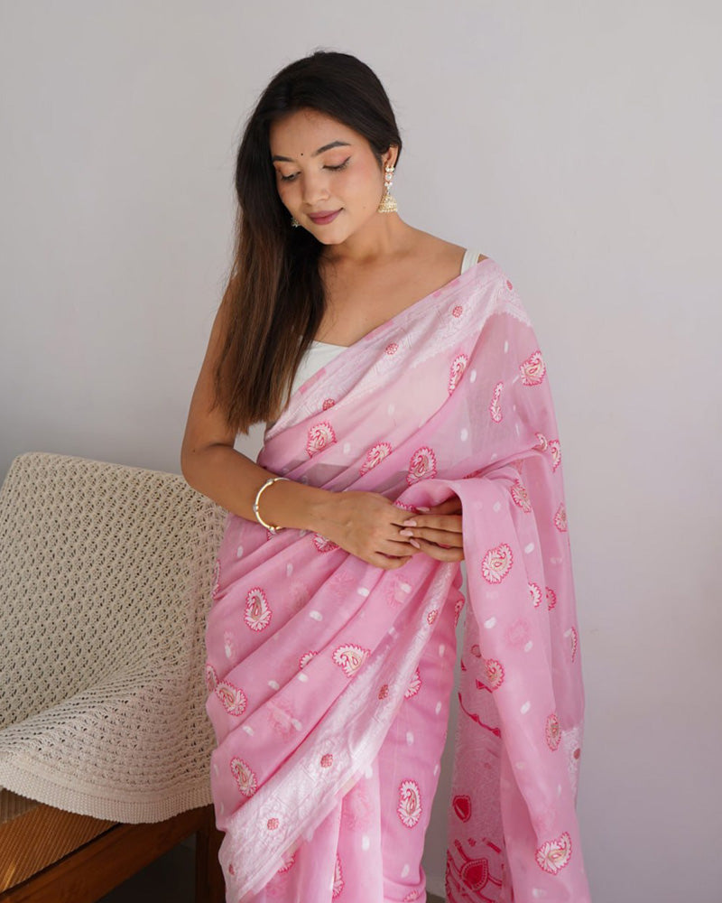 Radiate timeless charm in this Beautiful Pink Soft Cotton Saree, a perfect blend of grace and comfort. Crafted from soft cotton fabric, the saree drapes elegantly, offering a breathable and lightweight feel. The delightful pink color adds a touch of femininity, making it a versatile choice for various occasions. Paired with an unstitched blouse piece, this ensemble allows you to customize your look with ease. Whether it's a casual gathering or a festive celebration, the Beautiful Pink Soft Cotton Saree promises to be a classic addition to your wardrobe, embracing simplicity and elegance in every fold.