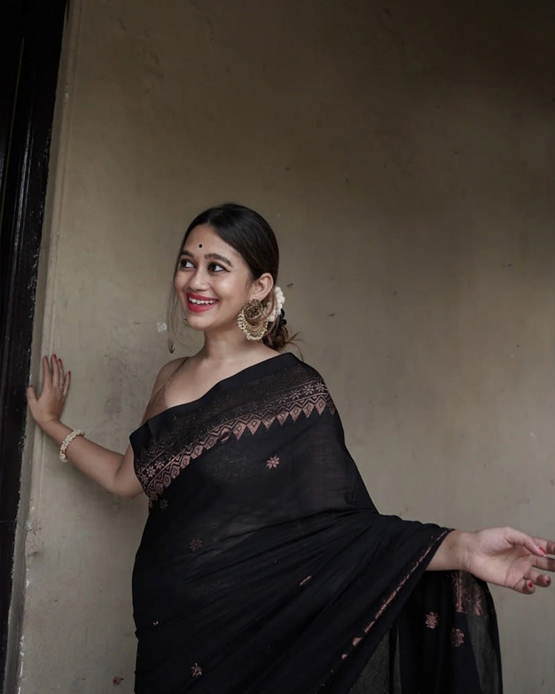 A timeless black Banarasi jacquard soft silk saree, showcasing exquisite weaving and elegant traditional designs. Perfect for weddings, festive events, and cultural celebrations, this saree exudes sophistication and grace. Paired with an unstitched blouse piece, it provides the flexibility for custom tailoring to suit your style.