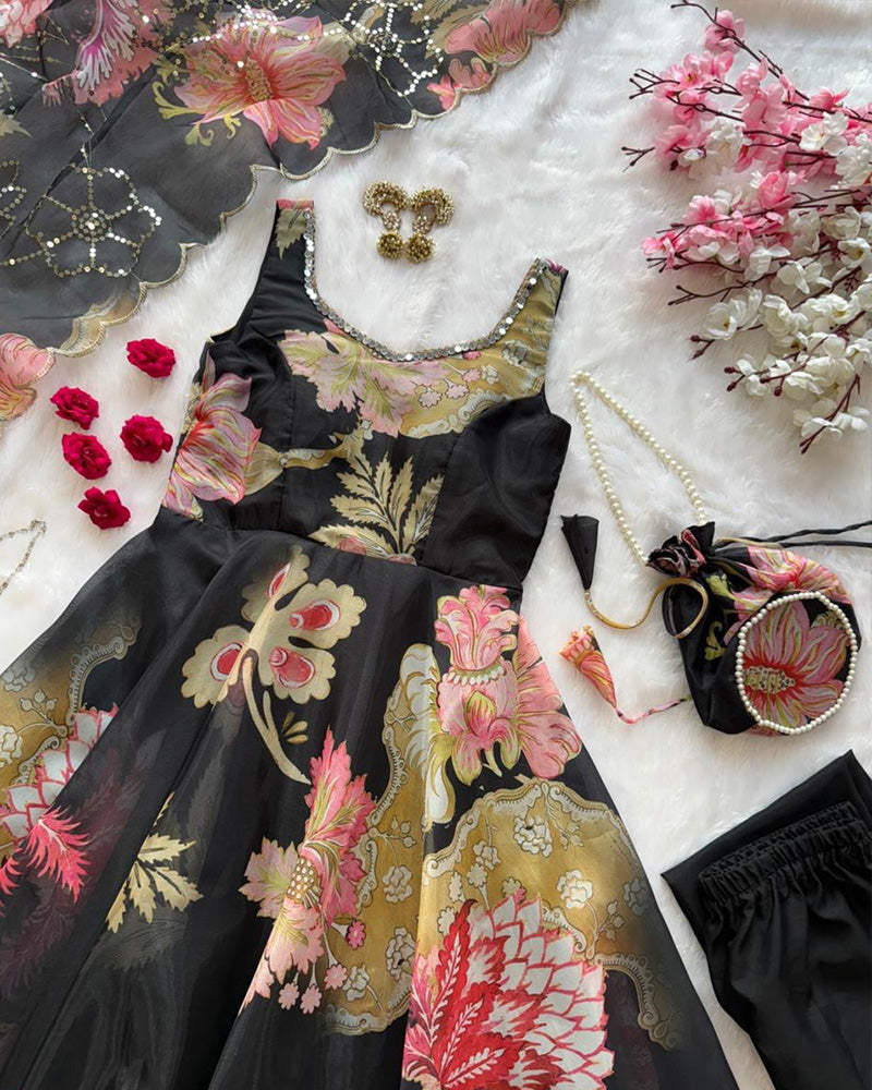 Black Color Digital Printed Soft Organza Anarkali Suit