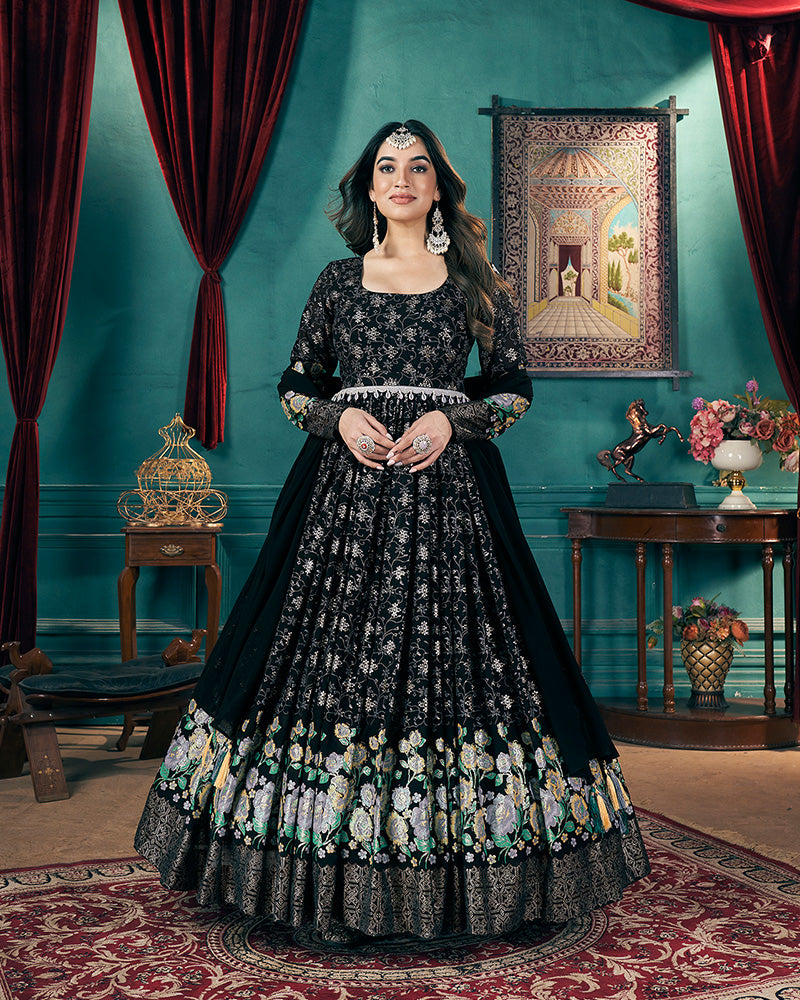 Exude elegance with this black faux georgette gown, adorned with intricate metallic foil work. The gown features a sophisticated silhouette that flows gracefully, paired with a matching dupatta to complete the ensemble. Perfect for weddings and festive occasions, this outfit combines modern glamour with timeless charm, ensuring a stunning and memorable look.