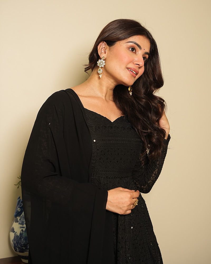 Embrace timeless elegance with this Black Color Georgette Lucknowi Three-Piece Anarkali Suit. Featuring intricate Lucknowi embroidery, this beautiful ensemble includes a chic Anarkali, matching dupatta, and bottom, perfect for weddings and festive occasions.