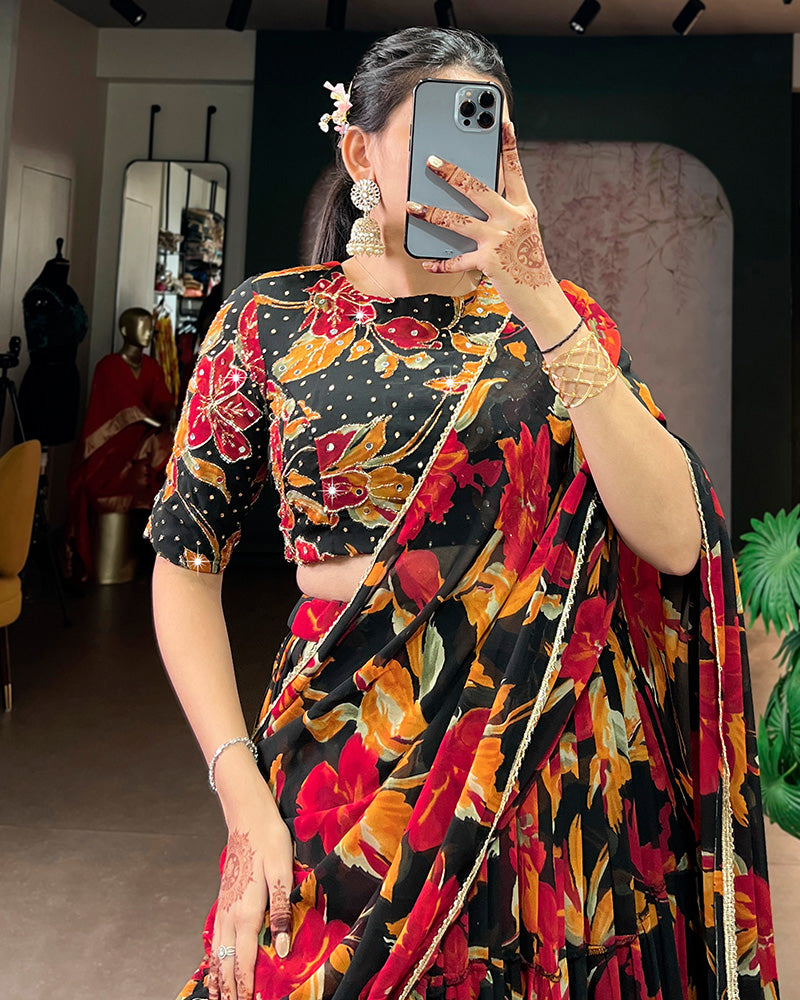 Black color marble floral printed lehenga choli featuring a beautifully flared lehenga adorned with elegant floral prints, paired with an unstitch blouse for a customized fit. Perfect for festive occasions and special celebrations.