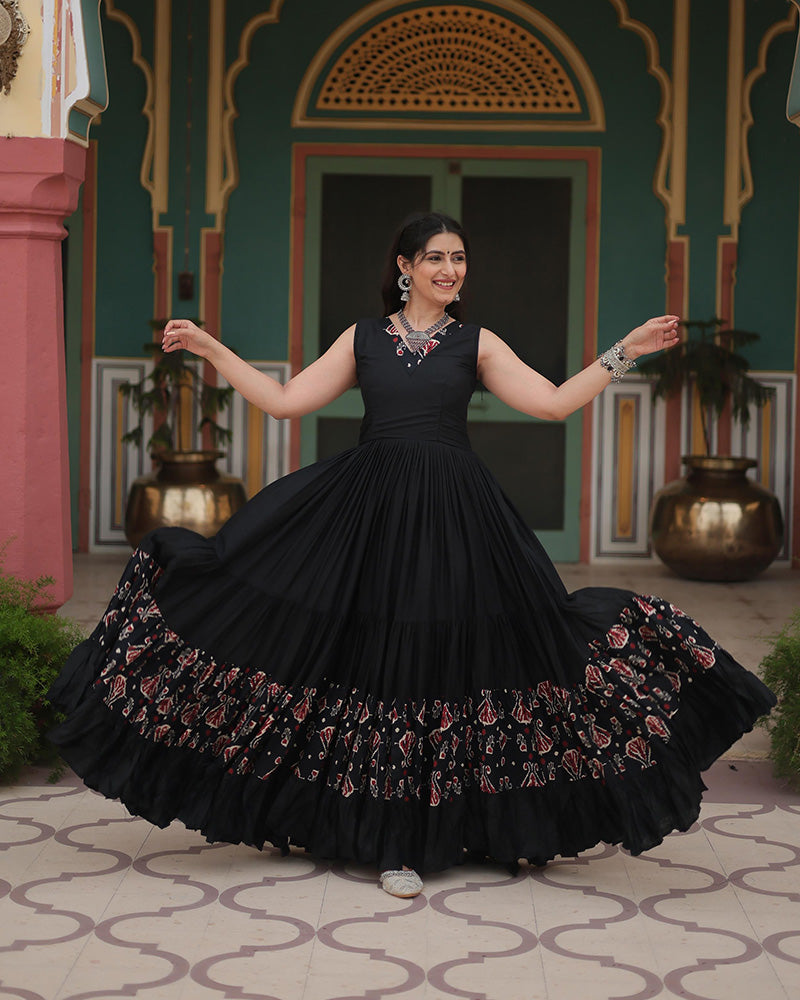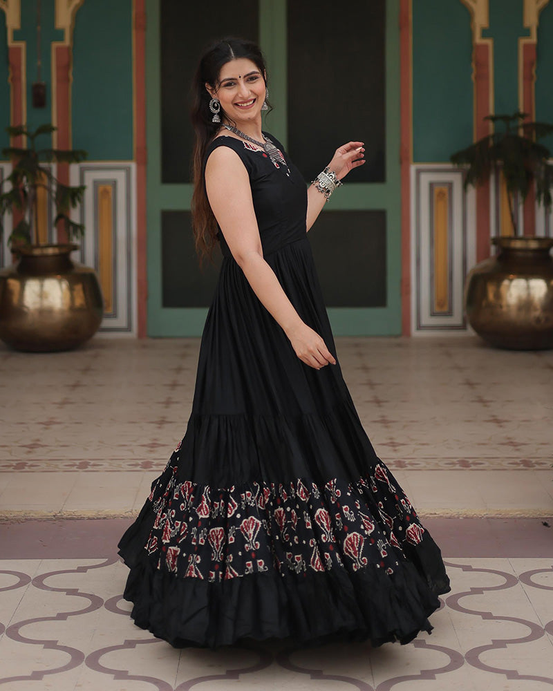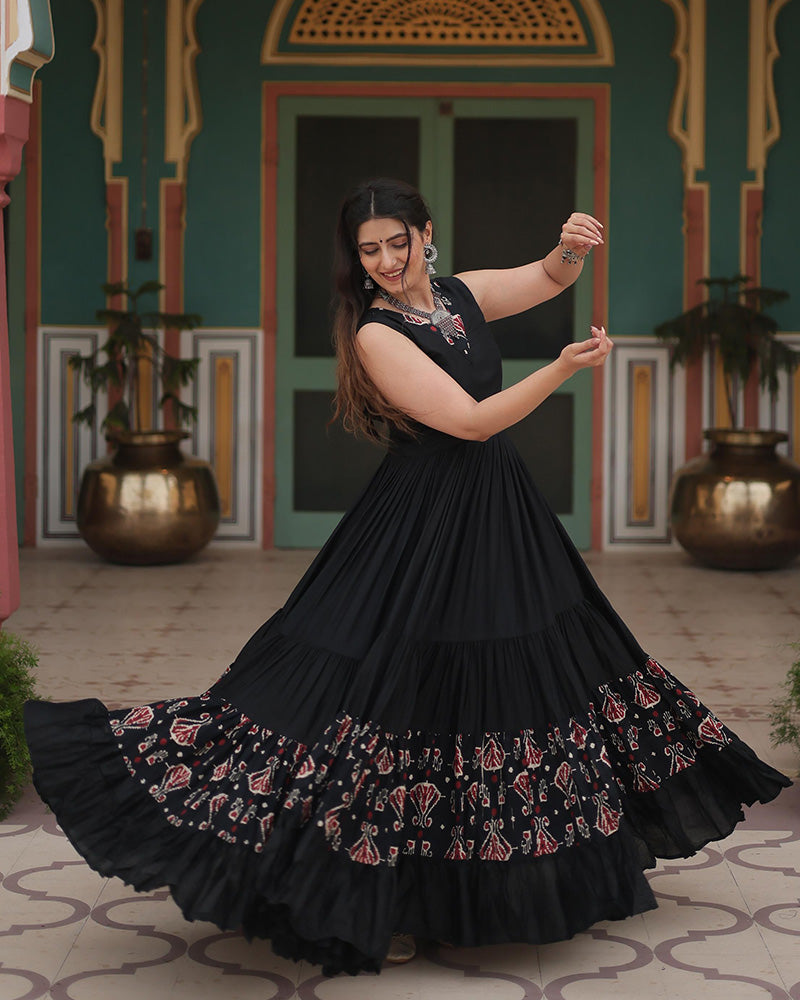 The Black Rayon Printed Navratri Gown is a sophisticated and stylish choice for festive occasions. Made from soft and lightweight rayon, this gown features a deep black hue accented by intricate prints that add a touch of elegance. Its flowing silhouette allows for easy movement, making it perfect for dancing the night away during garba and dandiya. This gown effortlessly blends traditional elements with contemporary design, making it an ideal choice for those looking to celebrate Navratri in style and comfort.