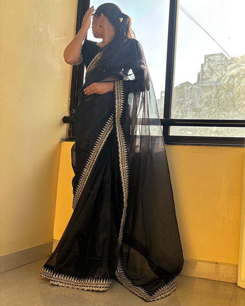 This elegant black soft twil net saree is beautifully adorned with intricate embroidery, creating a graceful and luxurious look. It comes with an unstitched blouse, allowing you to customize the fit for any special occasion.