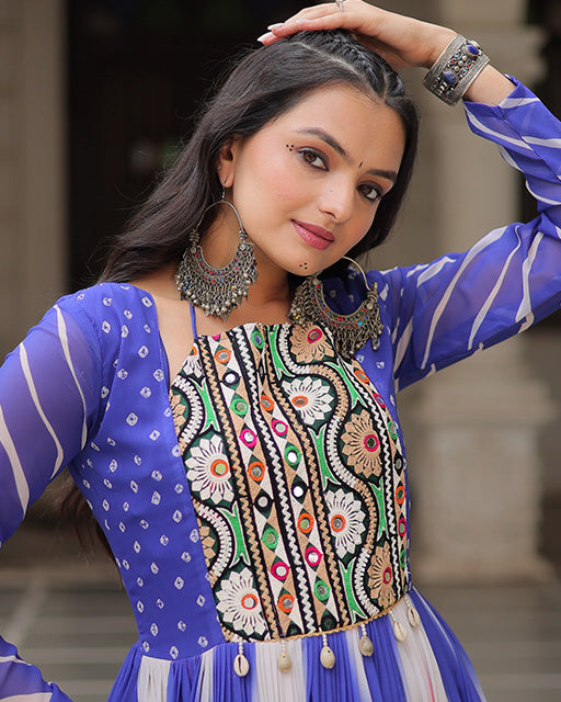 Blue Faux Georgette Bandhej Print Navratri Gown – A graceful festive gown crafted in soft faux georgette, highlighted with traditional Bandhej print. Perfect for Navratri, garba nights, and cultural celebrations, this outfit adds elegance with ethnic style.