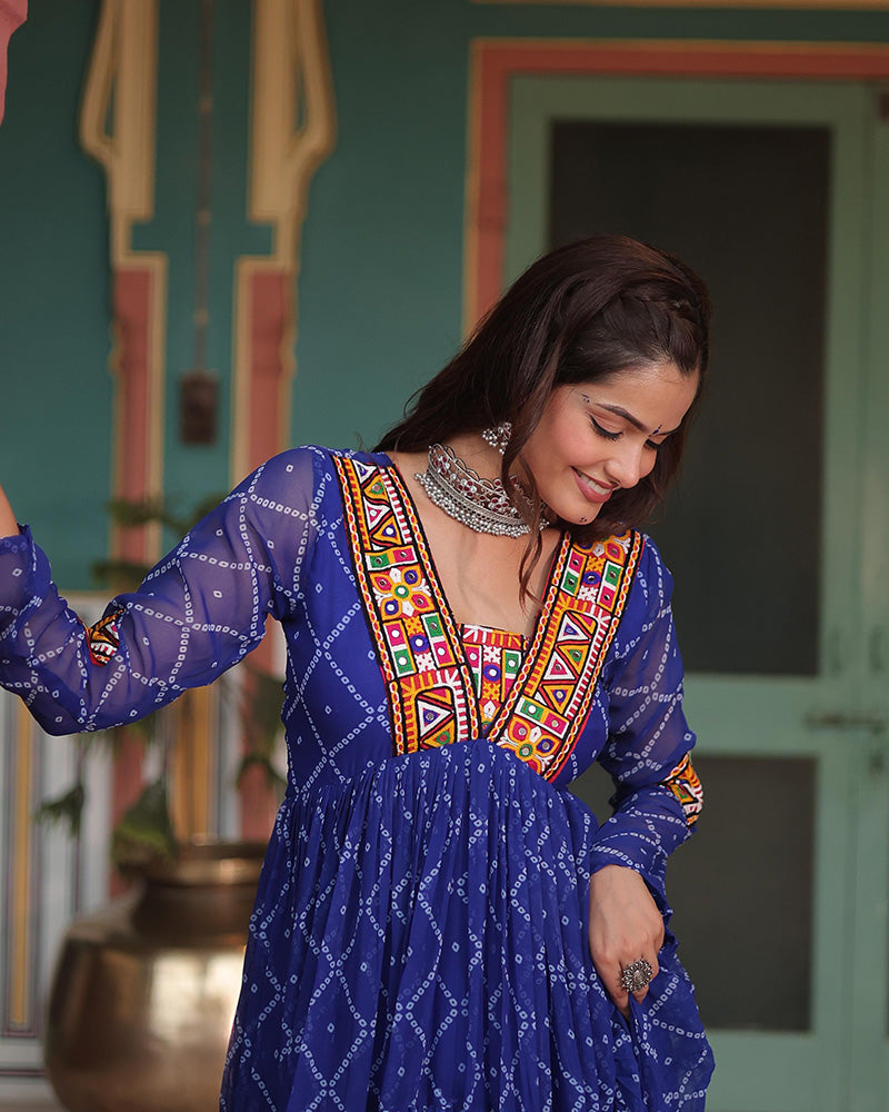 This striking blue georgette Navratri gown features a vibrant Bandhej print with classic tie-dye patterns. The rich blue color adds a dynamic flair, while the georgette fabric ensures a fluid, comfortable drape. Ideal for festive occasions, this gown combines traditional Bandhej artistry with modern elegance, making it a perfect choice for celebrating Navratri in style.