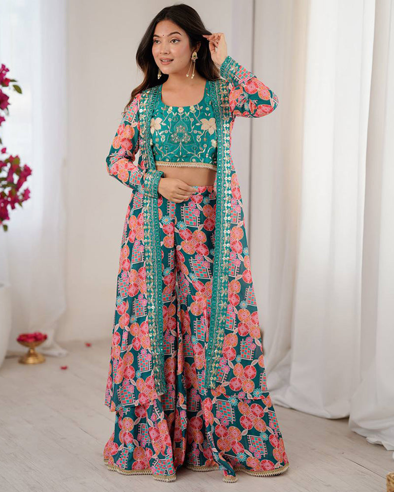 An elegant bottle green muslin cotton printed palazzo suit, crafted from soft, breathable fabric with graceful prints. The rich green shade adds a touch of sophistication, making it an ideal choice for festive occasions and casual gatherings.