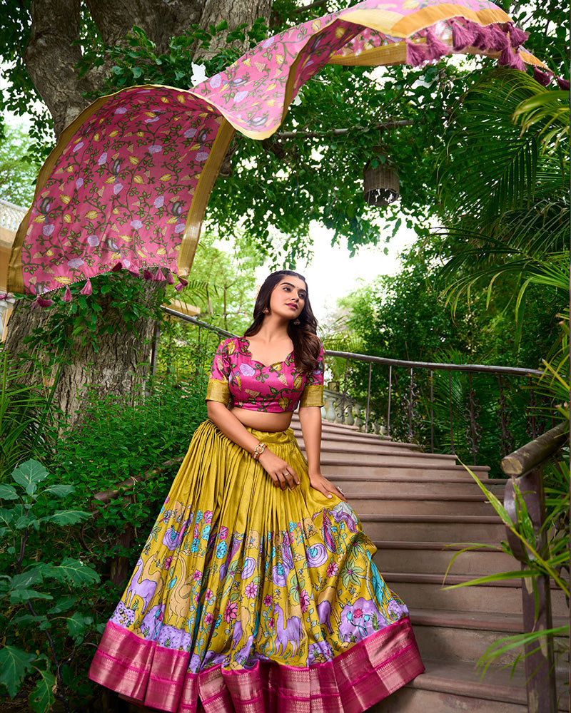 Mustard Color Dola Silk Designer Kalamkari Print Half Saree