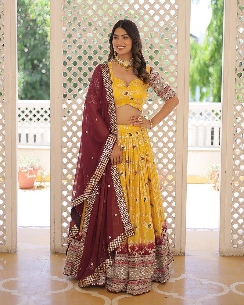 Introducing our Yellow Color Pure Viscose Jacquard Lehenga Choli, a radiant ensemble that exudes elegance and charm. Crafted from luxurious pure viscose jacquard fabric, this set features a vibrant yellow hue that captures attention. Accompanied by an unstitched blouse, it offers versatility in styling, allowing you to create your own personalized look. Perfect for weddings, festivals, or special occasions, elevate your ethnic wardrobe with this exquisite attire, sure to make a lasting impression with its timeless beauty.
