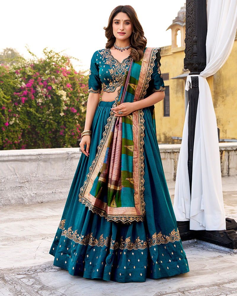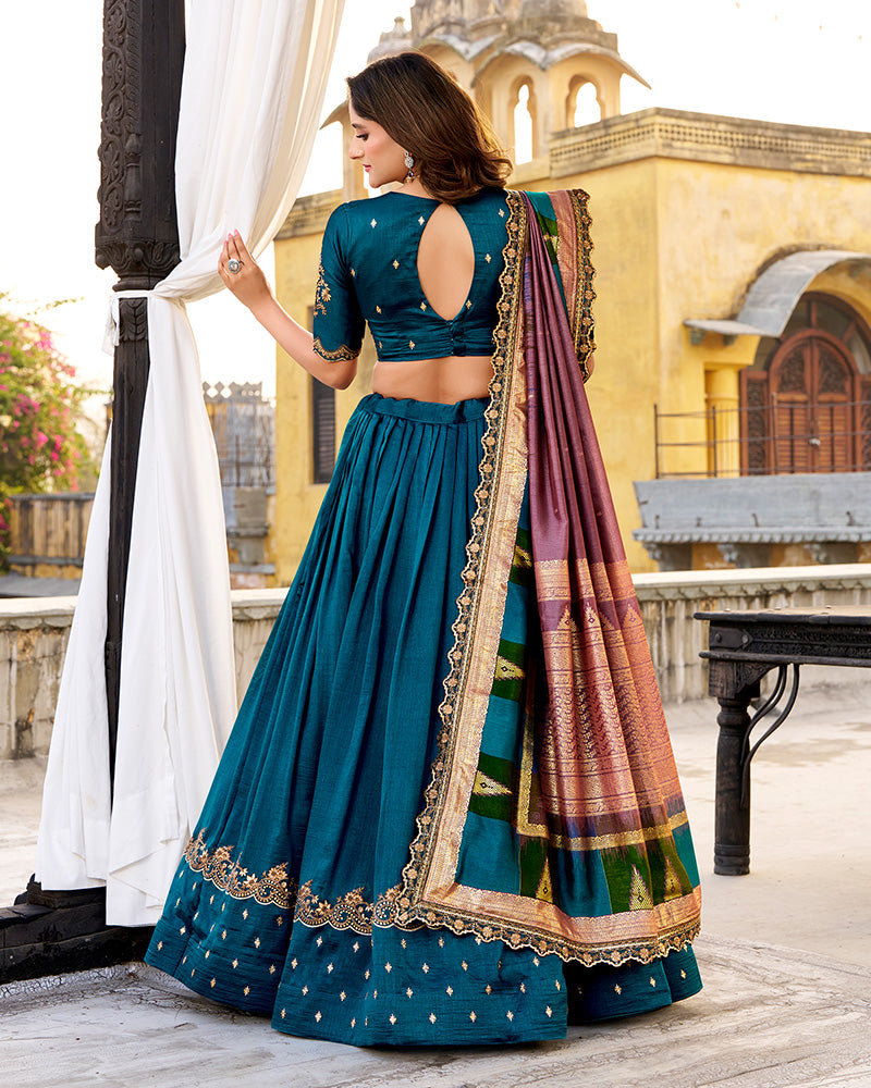 Designer Firozi Color Vichitra Silk Embroidered Lehenga Choli
