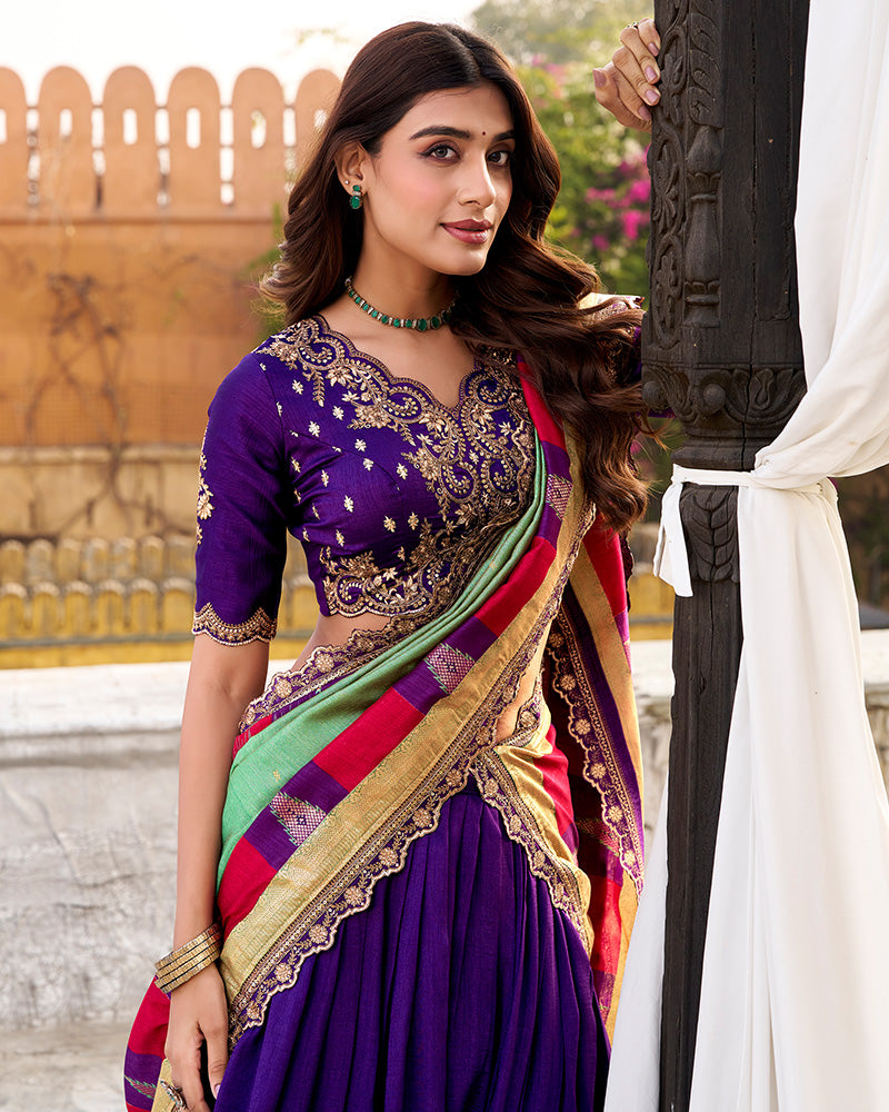 Step into elegance with this Designer Purple Vichitra Silk Embroidered Lehenga Choli, beautifully adorned with intricate embroidery. Paired with an unstitch blouse for a customized fit, it’s perfect for weddings, festive occasions, and special celebrations.