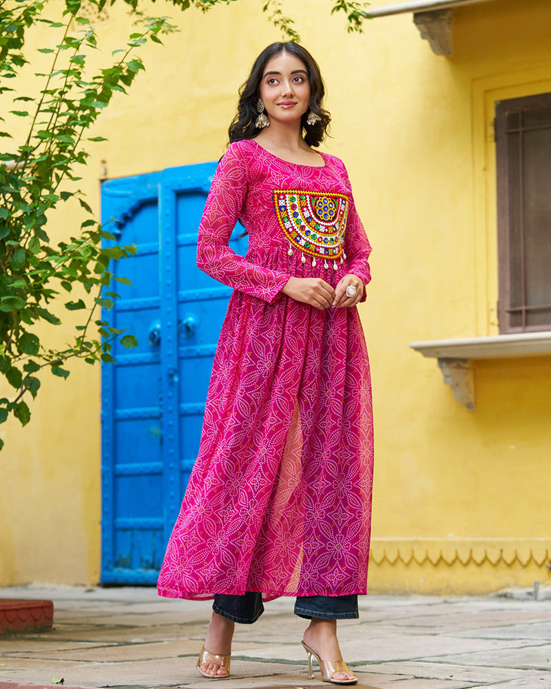 Festive pink georgette printed kurti adorned with colorful Gamthi patchwork, combining ethnic charm with graceful style for Navratri and special occasions.