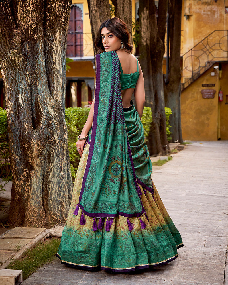 Firozi color vichitra silk printed lehenga choli featuring a beautifully flared lehenga with elegant prints, paired with a matching unstitch blouse for a customizable fit. Finished with a graceful dupatta, this outfit is perfect for festive and traditional occasions.