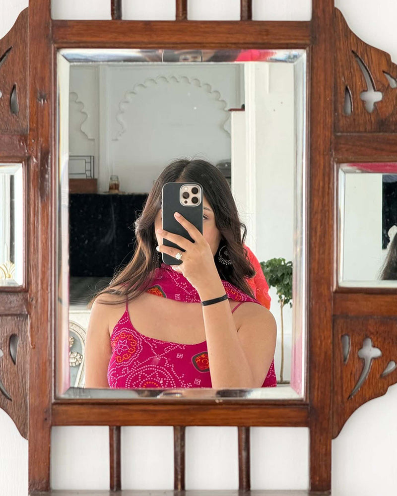 Beautiful @__geet__.❤️💋 Adorn yourself in the vibrant allure of this full-stitched Anarkali three-piece gown. The exquisite pink hue, enhanced by intricate floral bandhani patterns, creates a captivating ensemble. Designed to fit all sizes flawlessly, this gown effortlessly combines tradition with contemporary style. Elevate your presence at any event with this gracefully crafted attire, where the charm of bandhani meets the timeless appeal of Anarkali, resulting in a stunning and comfortable ensemble. 🫰🏻❤️