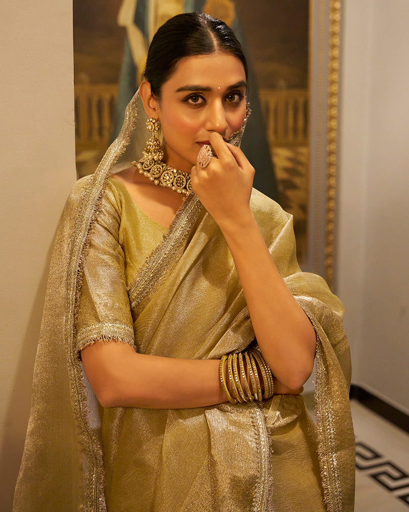 Radiate timeless elegance in this Golden Weightless Tissue Shimmer Saree. Crafted from ultra-light tissue fabric with a luminous finish, it drapes effortlessly and adds a luxurious glow to your look. Perfect for weddings, parties, and festive celebrations, this saree exudes sophistication with a touch of glamour.