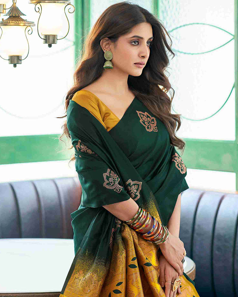 Graceful and timeless, this Green Banarasi Jacquard soft silk saree features exquisite jacquard detailing, offering a perfect blend of tradition and style. Paired with an unstitched blouse piece, it’s ideal for weddings, festivals, and celebratory events.
