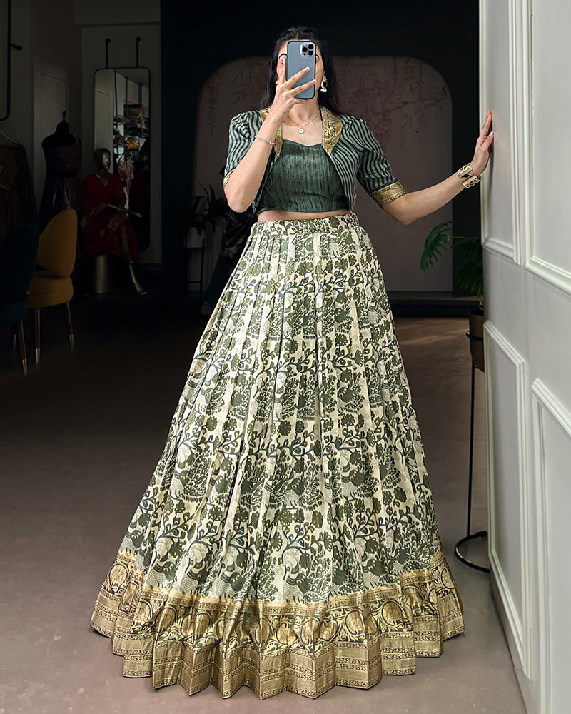 Beautiful green Tasar silk viscose lehenga choli with intricate prints, blending traditional elegance with modern charm. Perfect for festive occasions and celebrations.