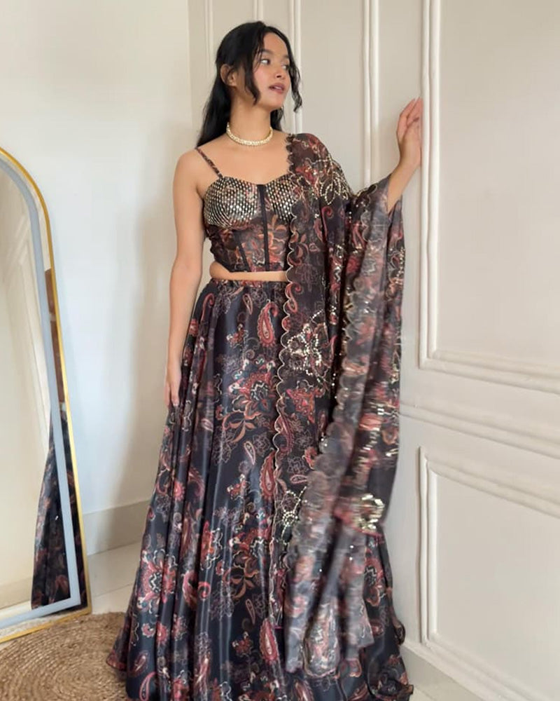 Step into contemporary elegance with this grey pure organza digital printed lehenga choli, featuring delicate and stylish prints. Perfect for festive occasions, parties, and weddings, it combines modern charm with traditional grace.