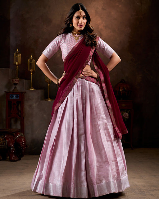 This exquisite Light Pink Jacquard Silk Lehenga Choli is a perfect blend of elegance and tradition. Crafted from high-quality jacquard silk, it features a stunning woven pattern that enhances its sophisticated appeal. The lehenga comes with an unstitched blouse, allowing for personalized tailoring to achieve the perfect fit. Ideal for weddings, festive occasions, and special events, this ensemble exudes charm and timeless grace