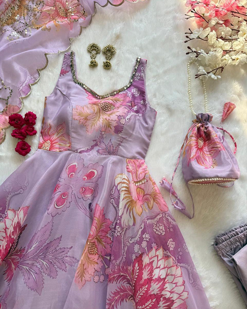 Lavender Color Digital Printed Soft Organza Anarkali Suit elegantly designed with delicate digital prints on lightweight soft organza fabric. Featuring a graceful flare and refined silhouette, it is perfect for festive occasions, parties, and special celebrations.