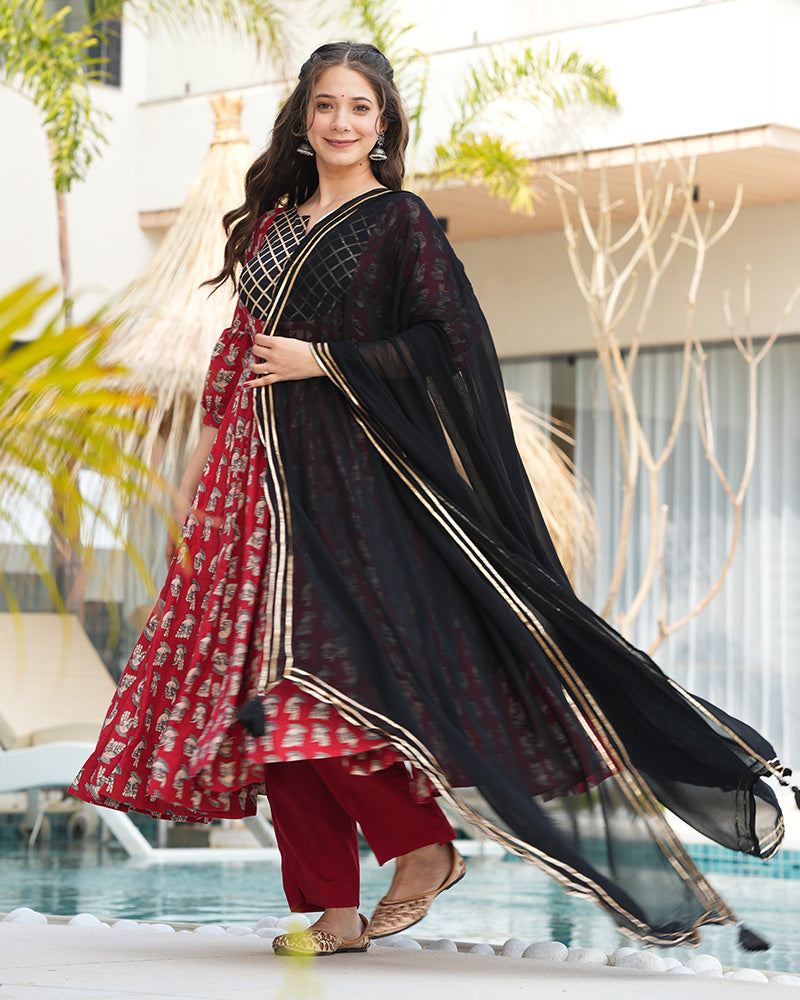 A stylish red and black printed pure cotton Anarkali suit, featuring a flowy silhouette with vibrant prints for a graceful ethnic look. Crafted from breathable cotton, it offers all-day comfort while exuding elegance, making it perfect for festive gatherings or casual wear.
