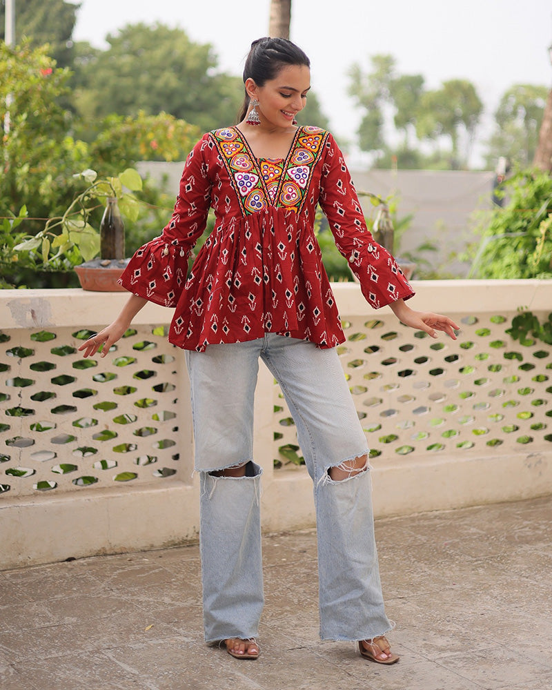 Celebrate tradition in style with this Maroon Color Cotton Printed Navratri Kediya, featuring vibrant ethnic motifs and a comfortable fit—perfect for Garba nights and festive flair.