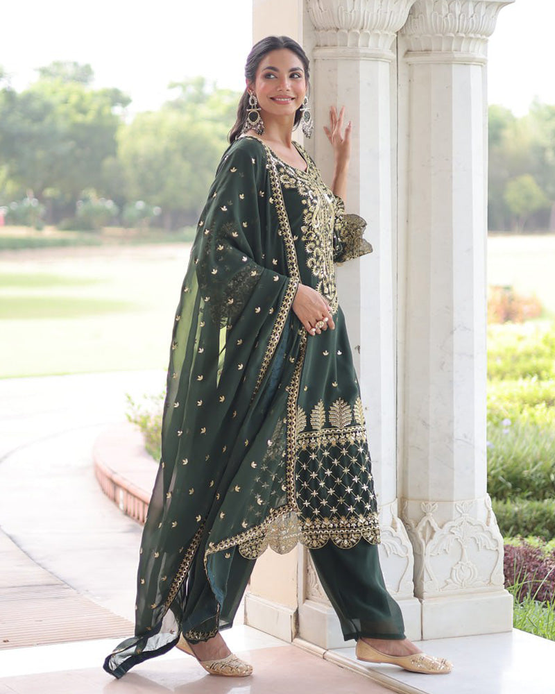 Graceful and earthy, this mehndi color georgette three-piece kurti suit is enhanced with elegant embroidery for a refined look. Complete with matching bottom and dupatta, it is perfect for festive celebrations and special occasions.