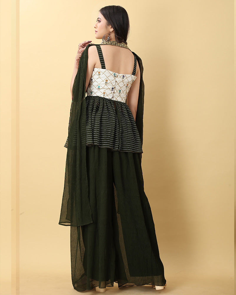 This mesmerizing three-piece sharara suit is a celebration of beauty and tradition in a captivating mehndi green hue. Crafted from delicate georgette fabric, it drapes gracefully, enhancing the wearer's elegance with every movement. Intricate embroidery work adorns the ensemble, adding a touch of opulence and intricacy to its timeless appeal. The set comprises a chic kurta paired with voluminous sharara pants and a coordinating dupatta, creating a harmonious and enchanting look perfect for festive occasions. Embrace the essence of sophistication and grace with this enchanting ensemble.